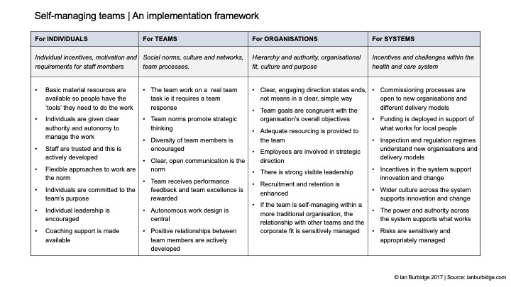 For self-organising teams to be effective, we can apply this same lens to the challenges they will face: what needs to be in place to liberate individual creativity and action, group norms and purpose, institutional support and ambition and system-wide incentives and learning. This is the skeleton of the framework I propose. I have distilled the insights and learnings from the range of sources referenced in this blog series into this framework. Presented below, it offers a summary of core for the implementation and operation of self-managing teams.