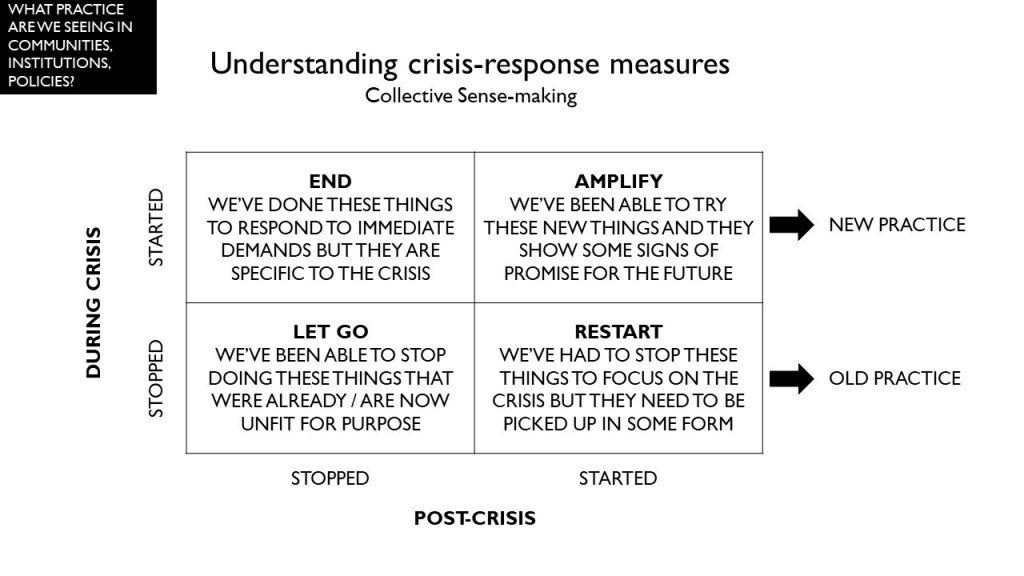 That’s why we are much more likely to go with the default, stick to known options and avoid risk. To try and counter this anti-risk instinct, I shared some thoughts on how we can track, make sense and learn from everything we’ve done in response to Covid-19. I offered the following framework – a simple way of thinking and talking about what our response could mean for the future.