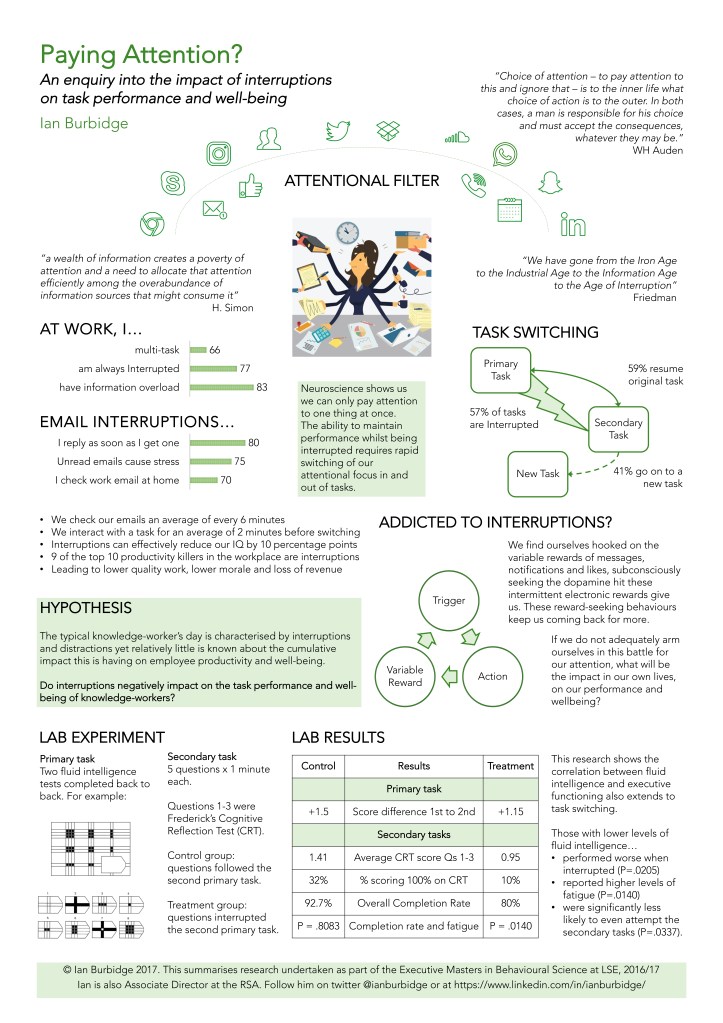 Studying for a Masters in Behavioural Science, then, seemed to offer the perfect opportunity to develop this line of enquiry still further and practically explore the impact of interruptions on the quality of work and well-being of knowledge workers.